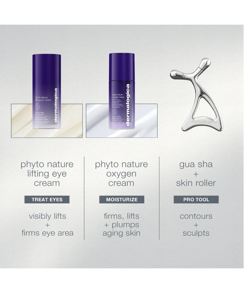 Phyto Nature Oxygen Cream breathes new life into skin with oxygen-optimizing phytoactives. Then, enjoy one use to measurably lifted eyes with a travel-size Phyto Nature Lifting Eye Cream, a firming and lifting eye treatment. Afterwards, elevate your routine with a limited-edition double- ended tool featuring both a Gua Sha and a skin roller in one.