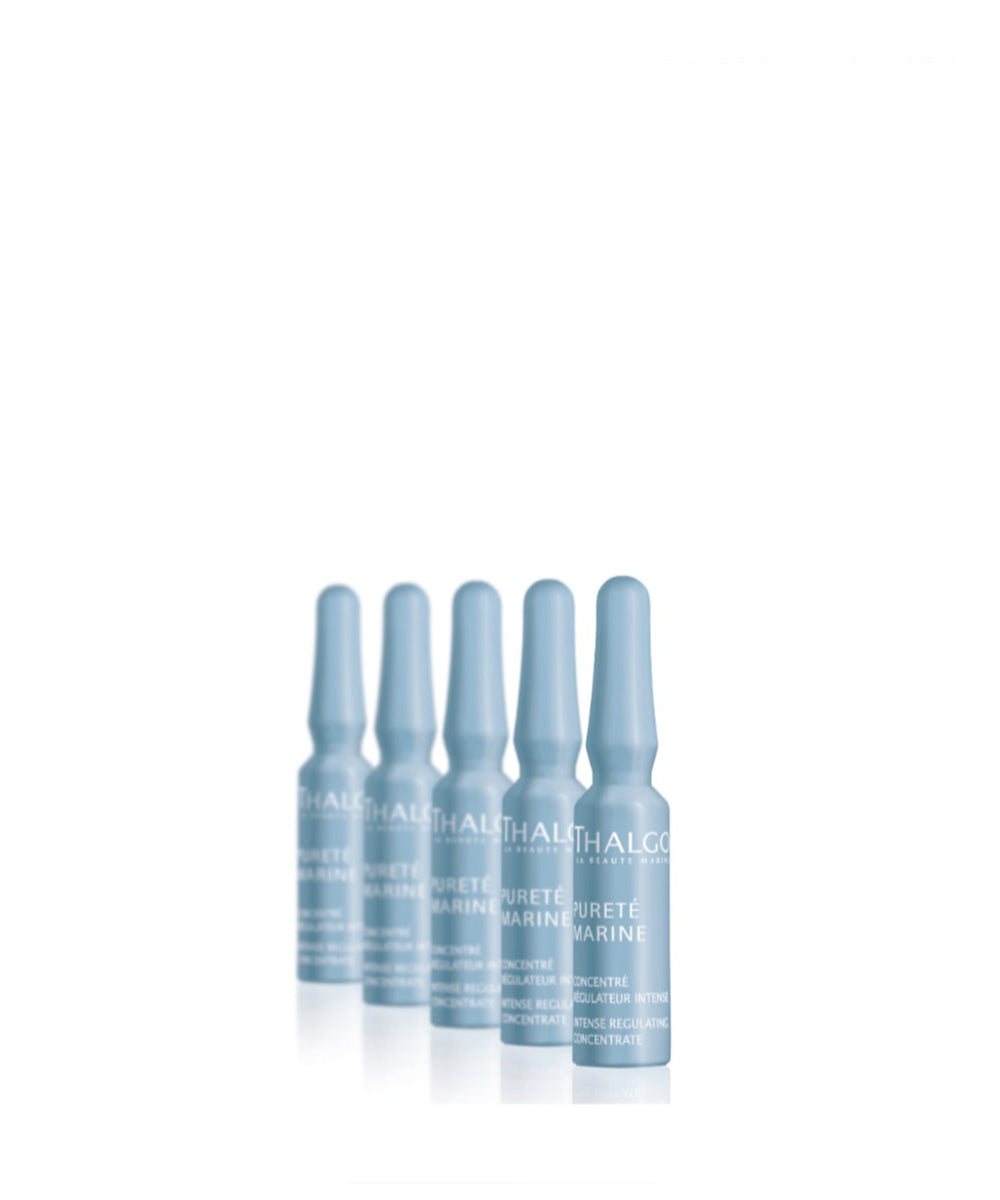 Thalgo Intense Regulating Concentrate is an intense treatment that aids in reducing seborrhea, restoring the quality of sebum, reducing skin thickness and unclogging pores. The skin and pores are purified and less prone to oiliness. These ampoules stop the development of bacteria responsible for blemishes for clear, fresh skin.