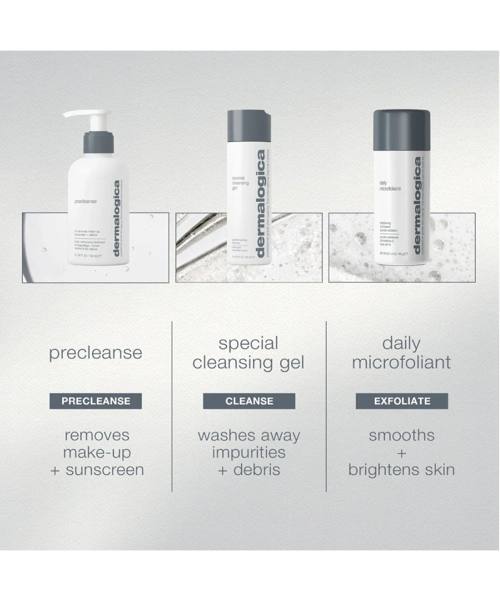 Achieve brighter, smoother, healthier-looking skin with our signature kit. Give yourself the Dermalogica Double Cleanse and get radiant skin with full sizes of PreCleanse, Special Cleansing Gel, and Daily Microfoliant.