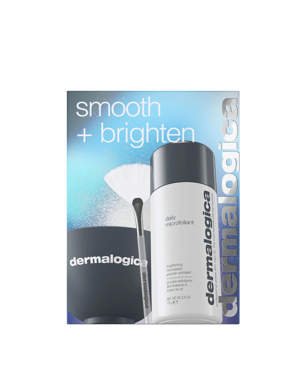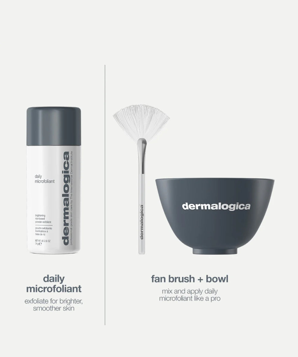 Brighten your everyday exfoliation with professional skin therapist- approved tools: a limited-edition mixing bowl and professional fan brush let you mix and apply Daily Microfoliant like a pro for a glow that’s more than skin-deep.