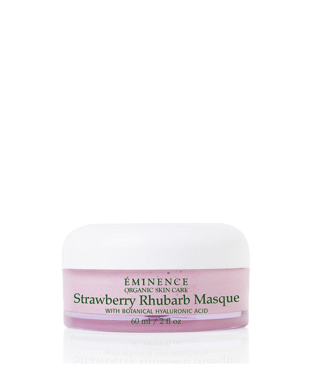 Eminence Organics Strawberry Rhubarb Masque revives dull, dehydrated skin. Formulated with strawberry juice, this face mask removes impurities and dead dermal cells as it tones, minimizing the appearance of large pores and refining texture. Shea butter and grape seed oil work to nourish and condition, while hyaluronic acid hydrates to plump your skin and diminish the look of fine lines and wrinkles for a smooth, youthful complexion. Nut-free.