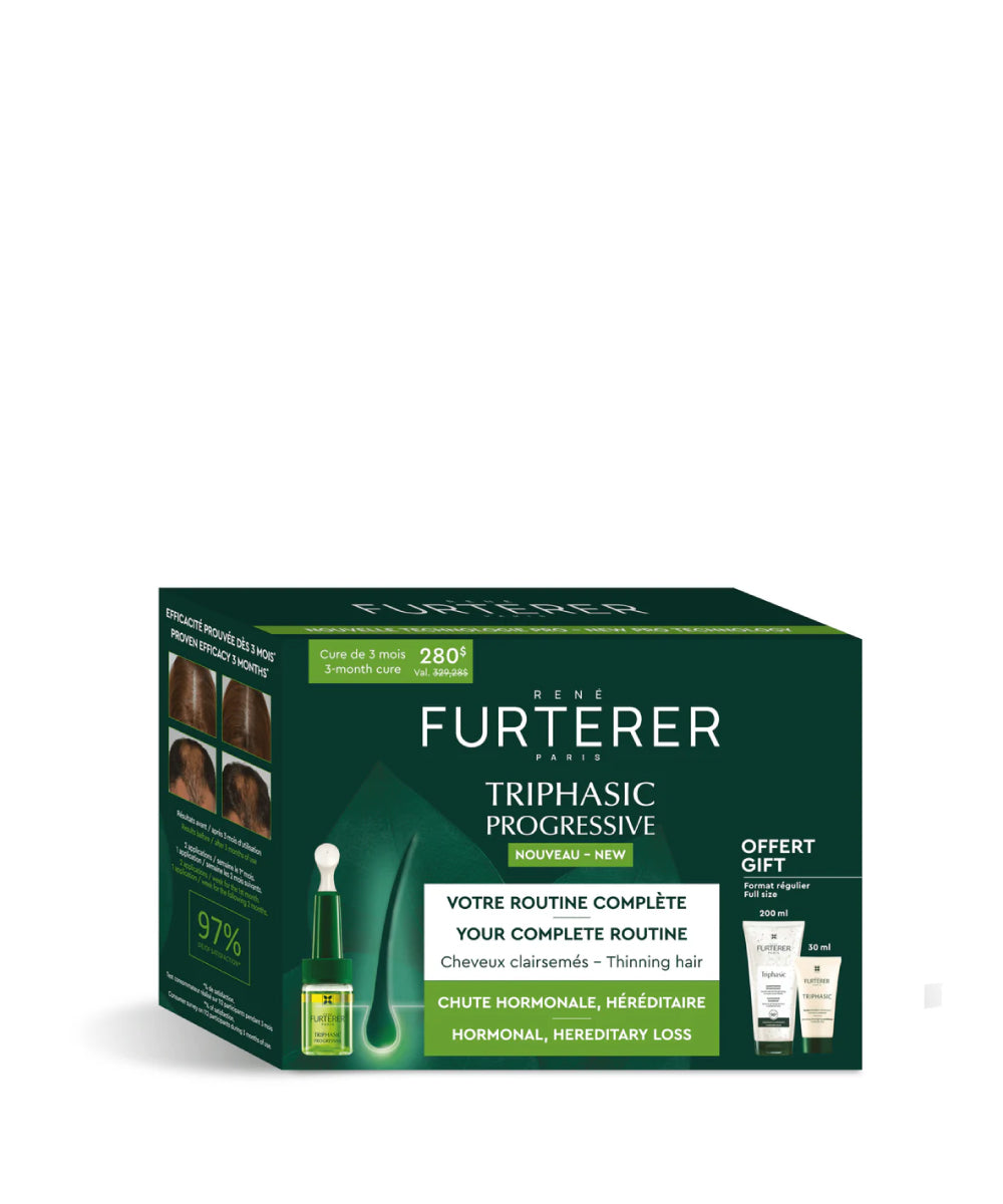 RESTORES HAIR DENSITY: After just the first month, loss of hair density is reduced. At the end of the cure, the hair is visibly denser, +10,023 hairs after 3 months of treatment**. TRIPHASIC PROGRESSIVE promotes a healthy environment for strong hair development.